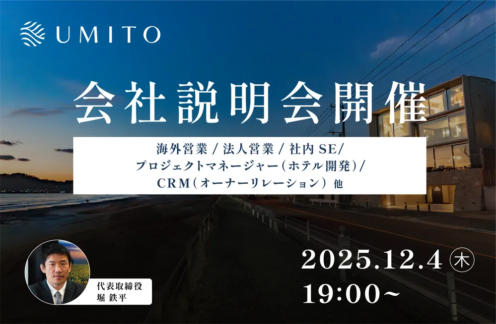 「海外向けの不動産販売キャリアを生かしたい」という方!海外、および国内在住の外国人の方向けに、海の目の前のラグジュアリーホテル、UMITOの魅力を、十二分に伝え販売していきます。現在、沖縄本島、宮古島、鎌倉、熱海、箱根などワクワクする新しい世界が広がっています。