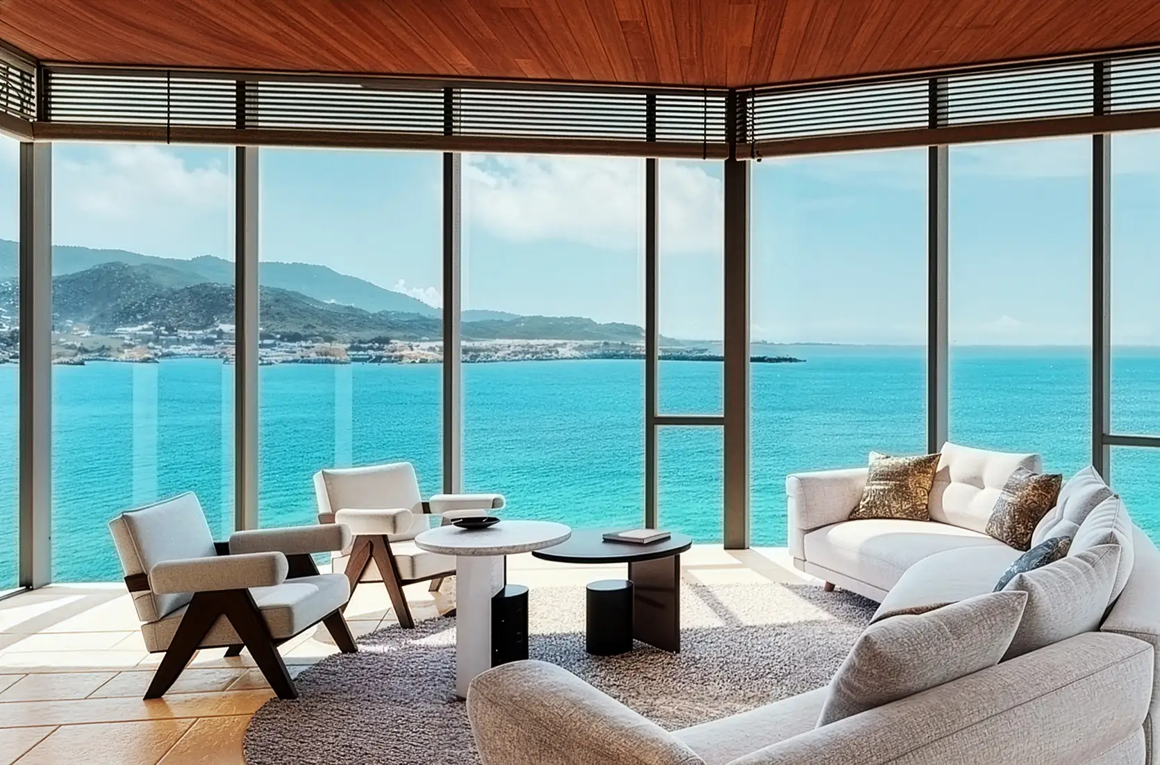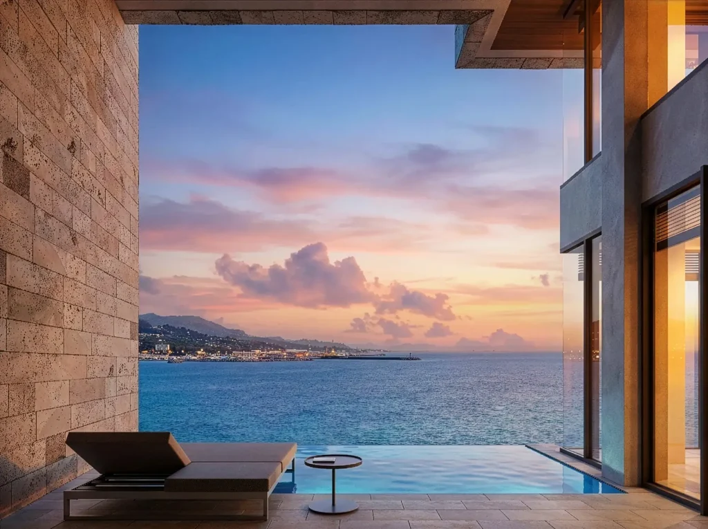 昼は空と海の開放感、夜には対岸の街の灯りが浮かび上がり、時間とともに表情を変える景色が滞在に静かなリズムをもたらします。