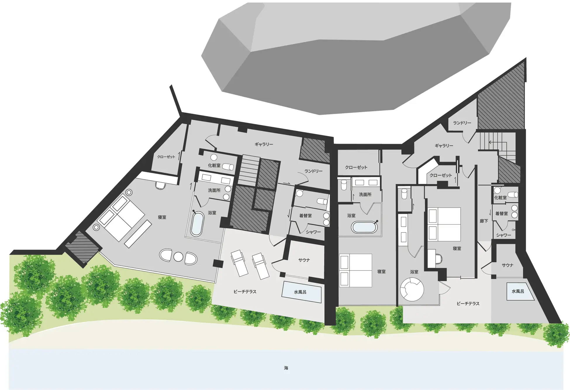 占有面積:ブリッジ棟 394.57㎡・ビーチ棟 394.89㎡