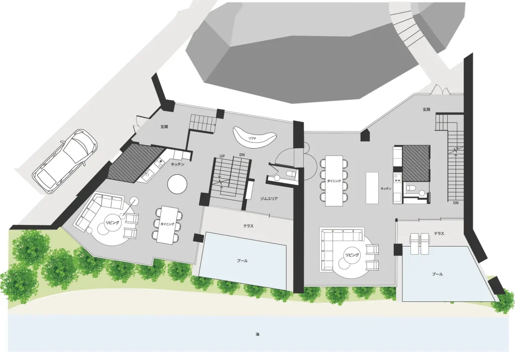 建物は琉球石灰岩の崖の下に配置され、周辺の眺望に配慮した計画のもと、自然に溶け込むように佇みます。内部では庭やビーチへと緩やかにつながる動線と、2つのユニットを自在に使える構成により、移動するほどに自然との距離が縮まっていきます。