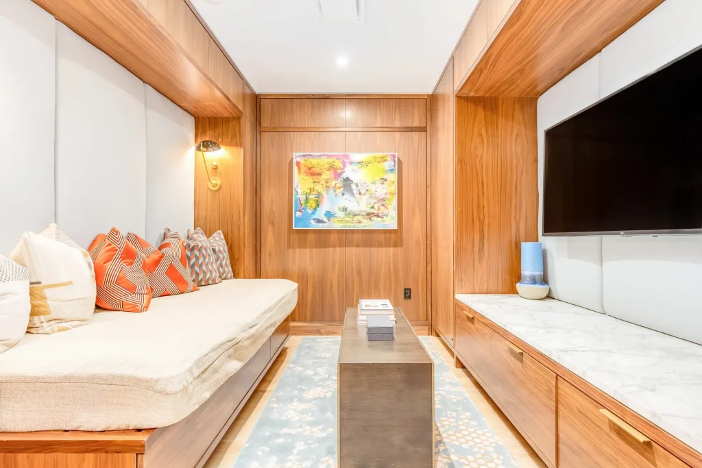 読書や映画鑑賞に最適なDENには大型モニターを備え、プライベートなミニシアターとしても利用可能です。