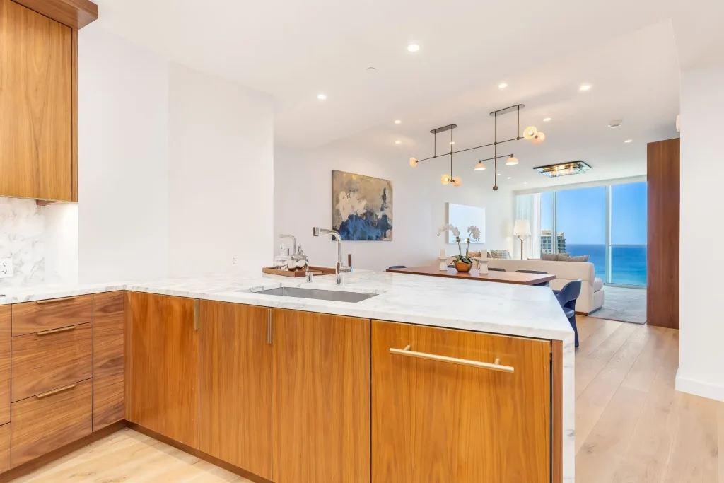 大理石のカウンターとウォールナットのキャビネットが調和した上質なキッチン。