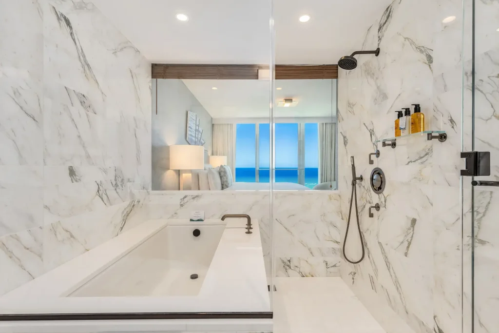 大理石を贅沢に使用したバスルームからは、海景を望みながらゆったりとバスタイムを満喫できます。