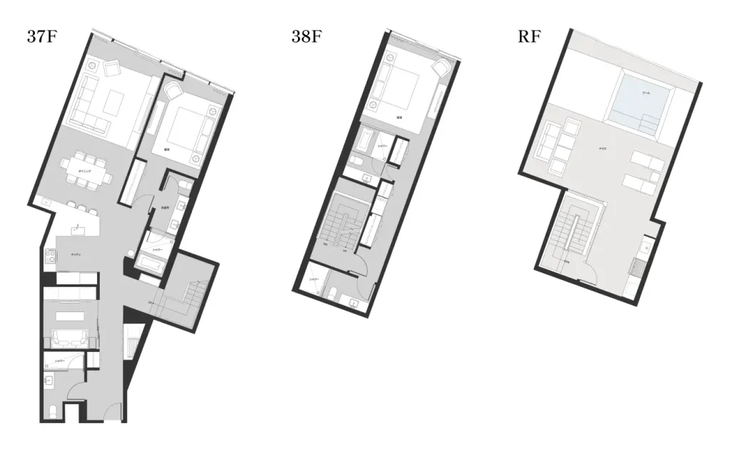 客室は2LDK+DENで構成され、37階にはキッチン、リビングダイニング、マスターベッドルーム、バスルームを、38階にはベッドルームとバスルームを配置。