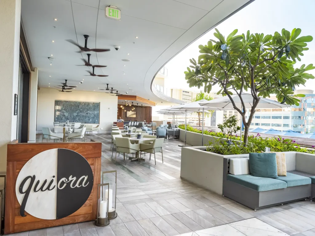 地中海のエッセンスを取り入れたレストラン「Quiora」では、ワイキキの大パノラマを望むオープンエアのダイニングで、厳選素材を活かした料理が楽しめます。ハワイの風とともに、洗練された食体験が広がります。