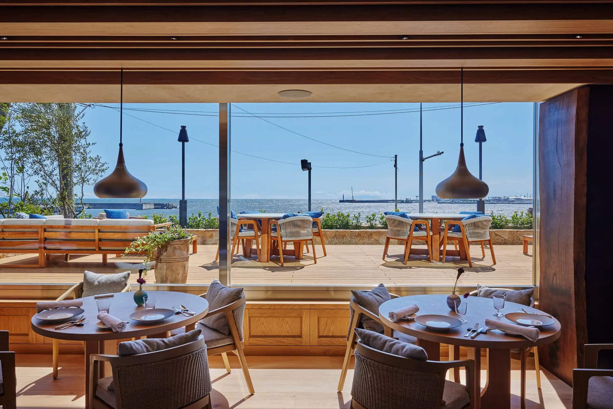 レストラン正面に広がるのは、海と空がひと続きになる鎌倉らしい景観。