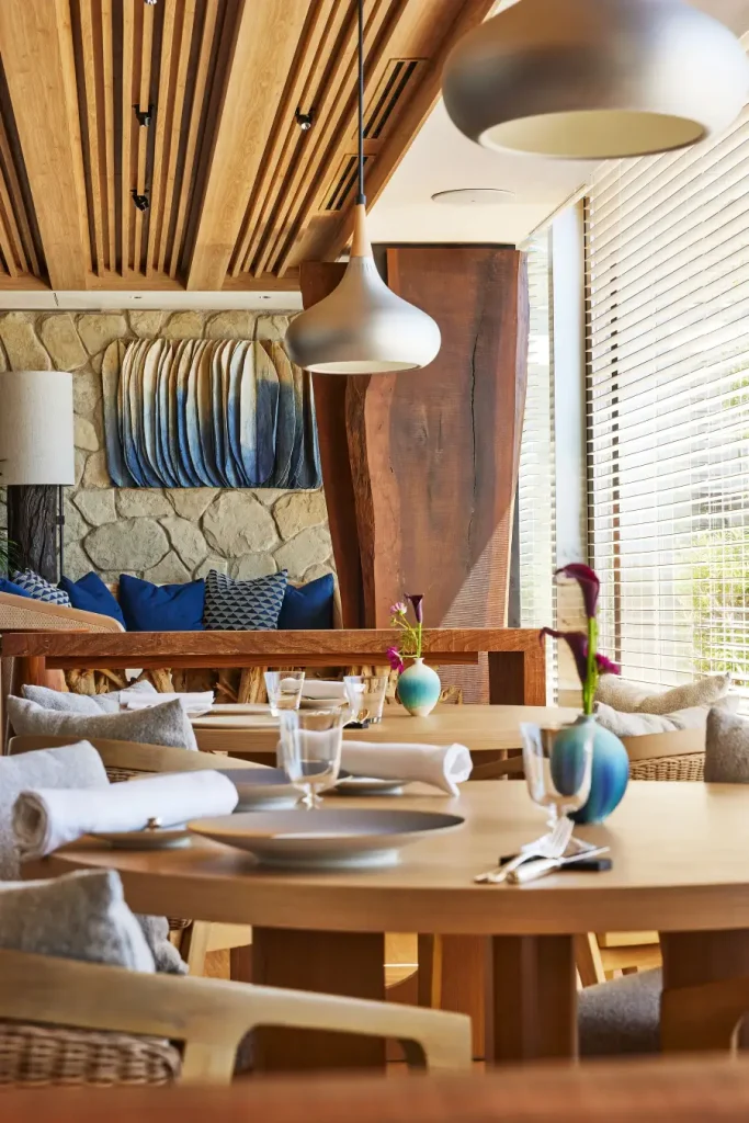 夕暮れが夜へと変わりゆく時間には、サンセットとキャンドルの光が静かに交じり合い、レストラン全体がやわらかい輝きに包まれます。